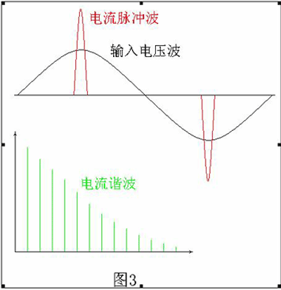 一般电容器C5的容量很大,其两端电压纹波很小,大约只有输入电压的10%左右,而仅当输入电压Ui大于电容器C5两端电压的时候,整流二极管才导通,因此在输入电压的一个周期内,整流二极管的导通时间很短,即导通角很小。这样整流电路中将出现脉冲尖峰电流,如图3所示。